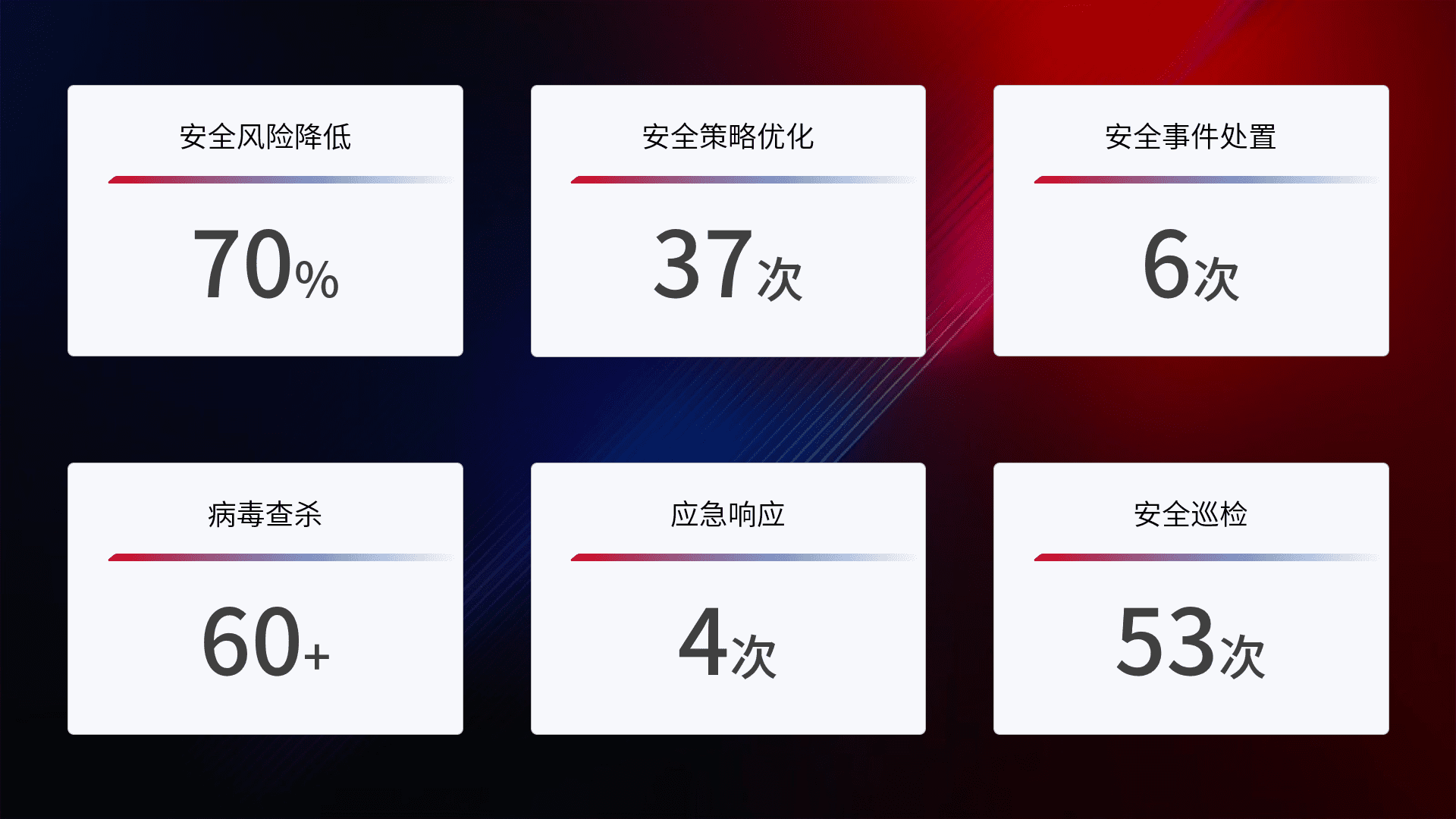 提供全面的安全事件报告体系,,包括处置报告、、、周报、、、、季度和年度总结,,结合持续监控,,,,帮助客户深入了解网络安全状况。。。。
