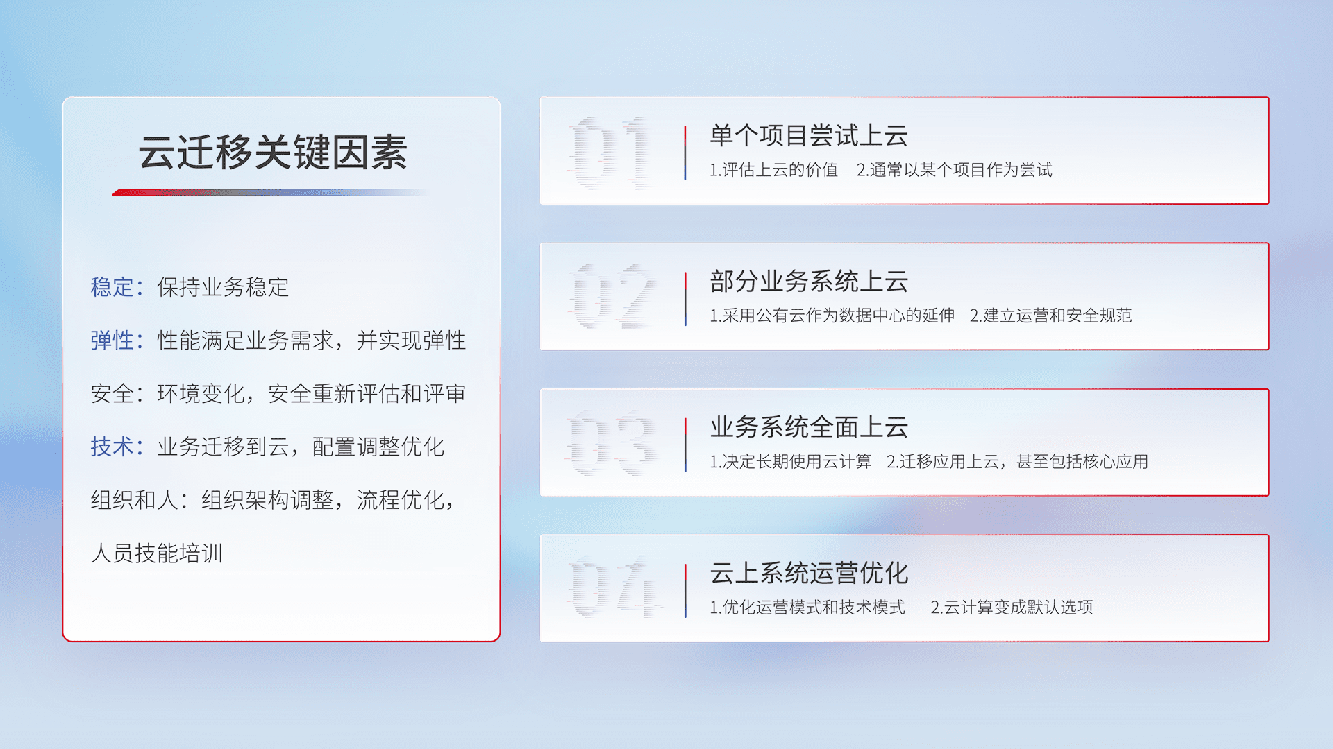 结合实际业务,,,,从规划设计、、、、云平台选型、、、、云原生改造、、、、数据迁移、、集成交付,,,迁移全过程为客户识别最佳上云路径,,做好风险识别管理,,,,设计网络架构、、身份权限、、、、安全审计合规、、、操作审计、、、、日志审计、、监控告警策略、、多站点容灾设计等,,对云上基础设施进行整体规划,,,,提升IT治理水平,,,以满足弹性、、、、高可用、、、高性能的需求。。。。