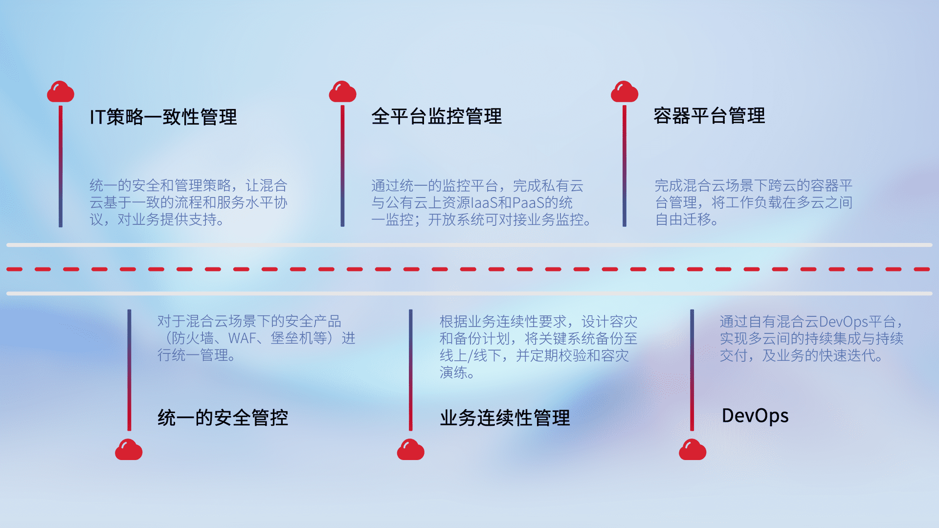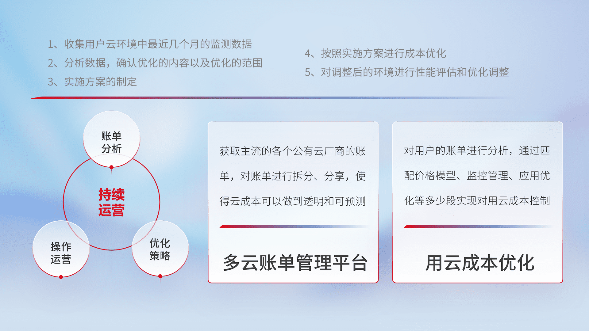 通过多云纳管,,,以统一的资源数据模型把客户的云资源进行抽象和封装,,,进而实现对多云资源的统一操作,,保障云资源管理的可靠性、、、、稳定性与可用性。。。量身定制化运维内容,,,配置、、开发运维、、、补丁管理、、、、备份、、监控、、认证和访问管理、、审计和日常巡检等,,保障在用云过程中的可靠度,,,,稳定度以及高可用率。。